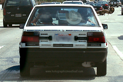This was taken southbound on the 5 Freeway on the way home, and there’s so much going on here that I don’t know where to begin. In case you can tell by the 20 badges on the back of the vehicle, it’s a mid-80s Toyota Corolla…with a dude in the back wearing a cowboy hat…holding a cello that’s sticking outside the window…of a mid-80s Toyota Corolla.