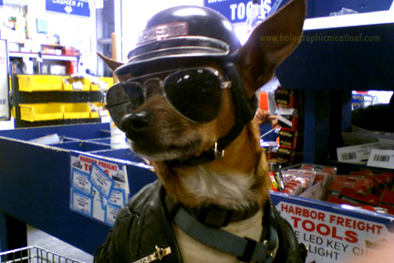 We went to Harbor Freight Tools today for a few things. While scanning the aisles, I noticed what appeared to be a stuffed dog wearing a leather outfit, standing in the kiddie seat of a cart. No big deal, I thought. There’s a lot of people in this world who would buy such crap.