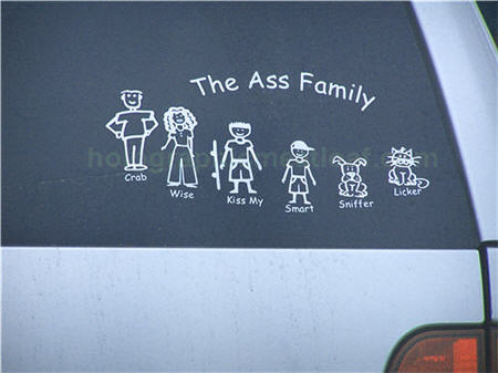 While waiting for the train to pass, I spotted one of those godforsaken die-cut “family” stickers on the rear window of the SUV directly in front of me. You know, the ones with the names of the family members directly below each stick figure that represents them? Yes, those. I despise them—badly.