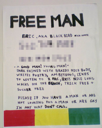 Those big blurs hide the man’s phone numbers. Evidently he’s so desperate for lovin’ that he’s sunk to posting his plea on public transportation.