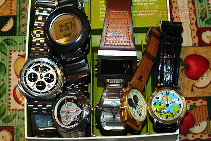 Buried somewhere in there is a Fossil that has an Atari Centipede-style color LCD that moves each half-second but is not an actual game. The topmost watch is a Suunto n6HR, a nice little gadget that was a media “thank you” gift from the kind folks at Lexus. (I attended a media event when I was writing for the magazine.) That thing allows you to receive MSN messages, gets news updates, and is also a heart monitor. Ask me how many times I used any of those things. Oh, and it’s the only watch I know of that you have to actually charge. No kidding–it came with a USB cable.