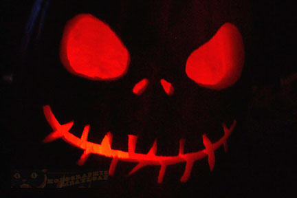 I figured since this is the 15th anniversary of The Nightmare Before Christmas, I thought I’d do mine as Jack Skellington. Although my original intention was to paint his face on the surface, I’m rather pleased with what I ended up with here. Anthony ended up only carving a little bit before he cut himself ever so slightly. That’s when he turned in his dull carving instrument and declared he “hated carving pumpkins!” He’ll be fine.