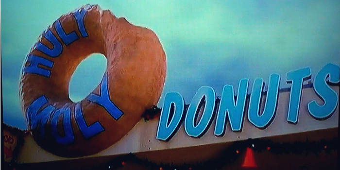 The first is from the movie and includes Holy Moly Donuts’ bogus Restaurant Grade from the L.A. County Health Department. One of my missing shots is a close-up of the sign which reads “FOR GOD’S SAKE, DON’T EAT HERE!” at the bottom. And yes, there were still some flies stuck between the sign and the window.