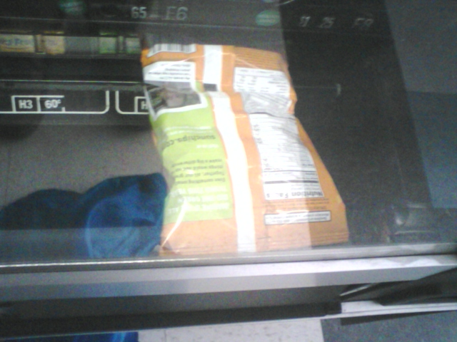 It was a few weeks ago when I posted this picture to Twitpic, expressing my overall disappointment in the fact that my bag of Pop Chips was thrown into a state of suspended animation as it was dispensed. As you might be able to see, there is another door inside the vending machine that I suppose is designed to deter or discourage theft. When you stick your hand in the machine, the secondary door appears from out of nowhere and protects the machine’s precious cargo from those looking for a freebie. (But should you be fortunate enough to have pliable limbs like Plasticman, you’re still good.)