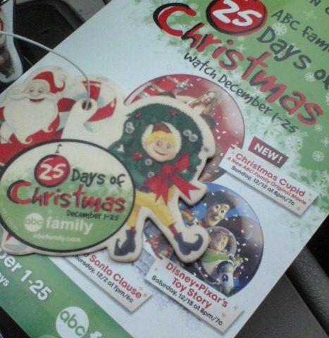 So I made my way to work with the poop-filled towel on the floor mat. It continued to stink up the place and was getting worse. Fortunately and ironically, a recent trip to Disneyland yielded an air freshener (see image above) that was attached to a fold-out card promoting ABC Family’s 25 Days of Christmas programming. They’ve been giving these out for the past few years as you enter the parking structure.