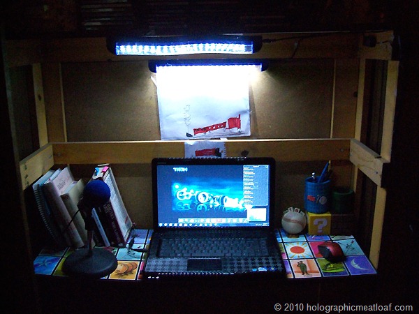 With the rest of the den in darkness, the LED strip lights affixed to the underside of the top shelf provide my corner with illumination in a cool blue hue. I bought these lights on clearance a few years ago for, if I recall, $1.50 per strip and despite not knowing when I’d ever need them, I thought they were cool and took them home. They are designed to be placed under kids’ beds so those who believe that The Boogeyman or El Cucuy will come crawling out from underneath can sleep easier at night knowing that the light will scare those two monsters away. The lights also came with five plastic filters that can be placed inside to change the color of the illumination but I’m perfectly happy with them as they are.