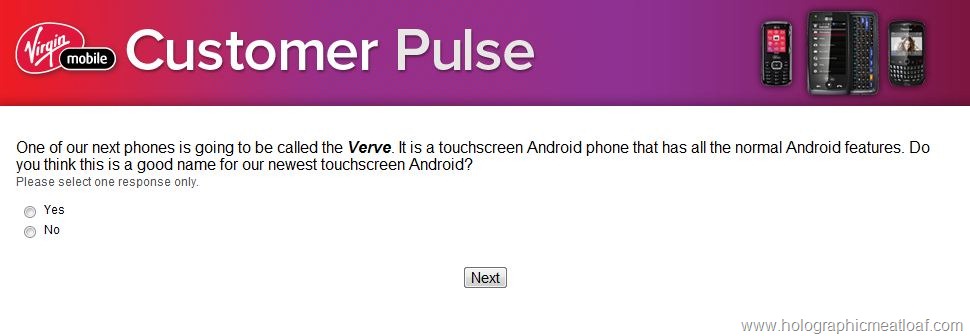 Hey, it looks like Virgin Mobile has yet another Android phone on the horizon! No specs; the survey just asked me what I thought of the name they planned for this “touchscreen Android phone” with the standard Android features.