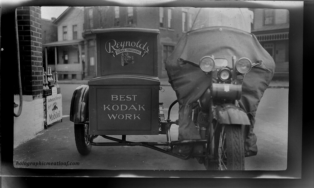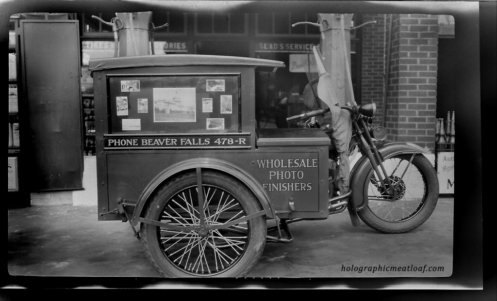 I found it ironic that the best photos were of this Harley-Davidson motorcycle that was presumably used to deliver photos around the town of Beaver Falls, PA. (How do I know the location? Or that the bike is a Harley? You’ll see later.) I really dig the hand-painted Reynolds Kodak Finishing logo as well as the old Mobiloil “Genuine Gargoyle” sign in the background on the left.