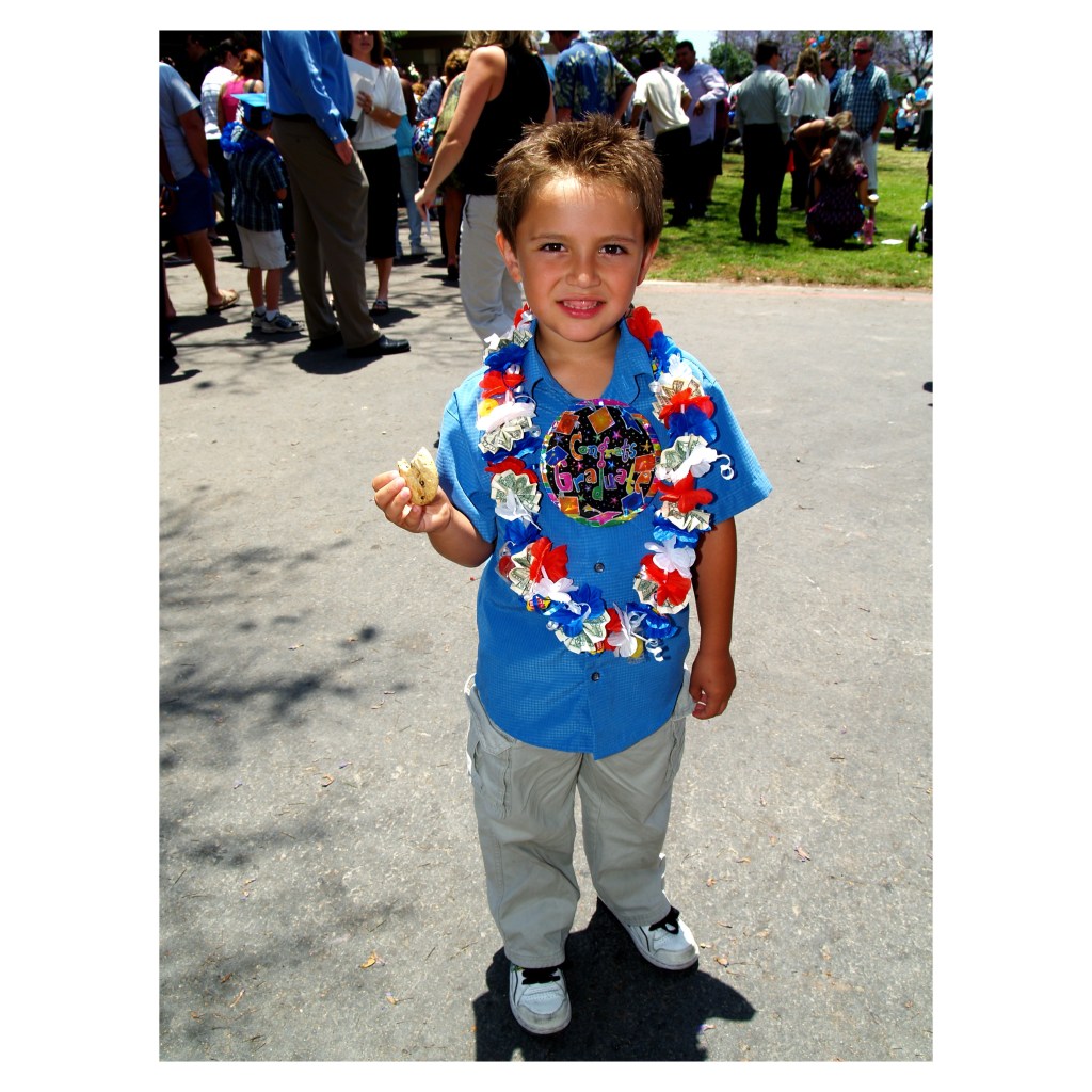 Here is Anthony at his kindergarten graduation and I nearly cried when he ran out of the room with his construction-paper mortarboard and cookies in hand. In fact if I remember correctly, the first thing he asked me was if I had finished the bottle of water I had during the ceremony because he was thirsty. It was the first huge event I would see, and keep an eye on that “Congrats Graduate” button given to him by his grandmother.