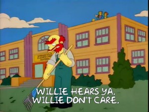 Situation: When Principal Skinner declares from the roof of Springfield Elementary that he, Bart and Mrs. Krabappel have barricaded themselves inside, this is Willy’s reply as he keeps on working.